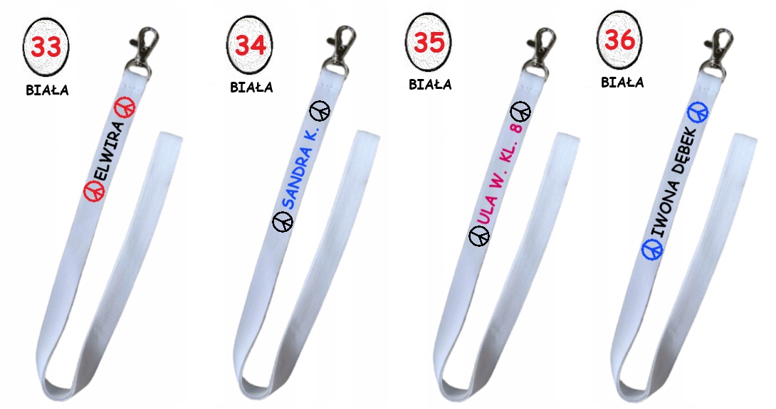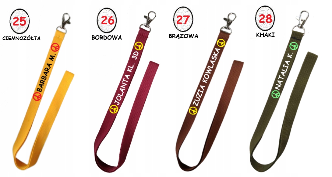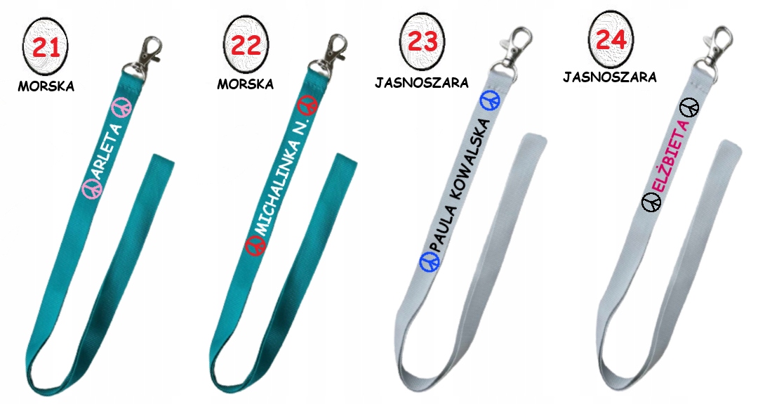 * smycz (na srebrnym karabińczyku) w wielu kolorach do wyboru, m.in. czarnym, białym, błękitnym, bordowym, zielonym, czerwonym, żółtym itp.